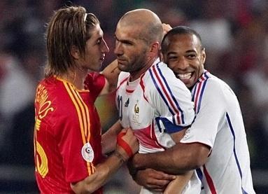 倒されFKを得る。ジダンが入れたボールは中でDFが触っ
