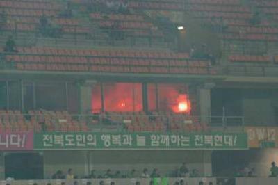 全北現代のサポーターも凄かったです。発煙筒、こんな処で燃やしていました。