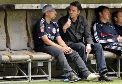 練習中、ベンチでインタヴューをこなしてる、リベリさん。