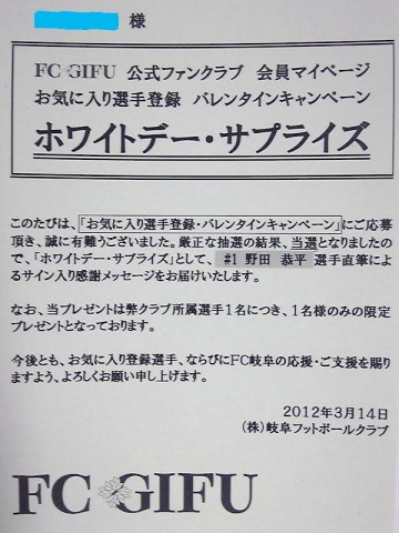 帰宅した主人から、私宛の封筒を受け取って、差出人を見たところ、「岐阜フットボールクラブ」とありました。