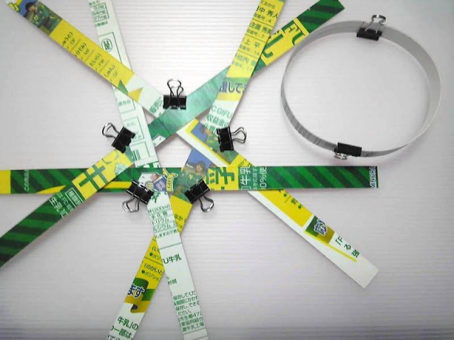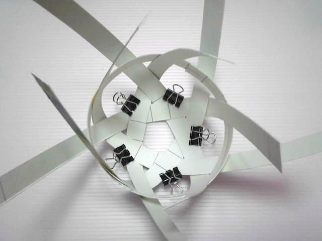 5本を組み合わせて、五角形を作るように組んで、クリップで仮止め。