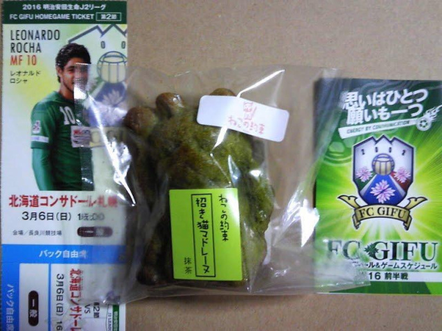 前日ボランティアに参加する前に、FC岐阜ホーム戦のチケットを扱ってくださっている、JR岐阜駅の『ねこの約束』さんで、緑色の抹茶味の『招き猫のマドレーヌ』を買いました。
