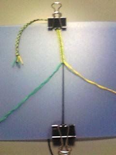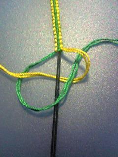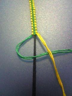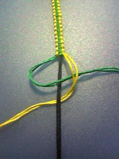 緑糸を黒糸の上に乗せて、黄糸をまたその上に乗せる。