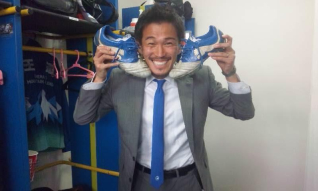 「撮っていいすか?」と言ったらいろいろロッカールームをあさってこのポーズ