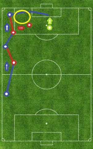 これとは逆にウイングの選手がサイドに流れ、サイドバックの選手がゴール前に入り込むパターンも存在します