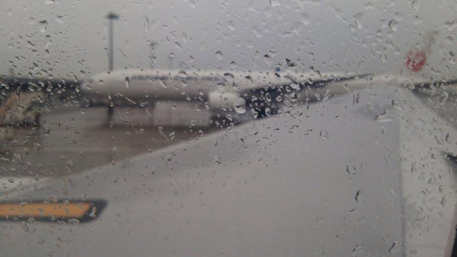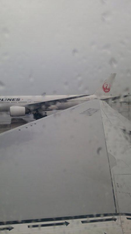 バスで揺られて、機体前で、今日は雨なので真ん中から、タラップに