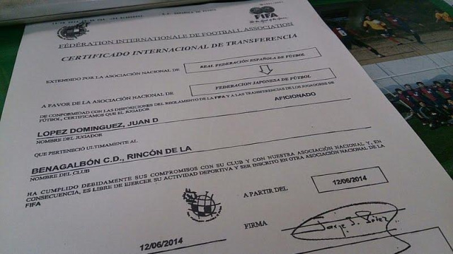 エレンシアのスペイン人選手、ファンディことファン ディエゴ ロペス ドミンゲス選手の国際移籍証明書がスペインサッカー協会から届きました。前所属チームからエレンシアに移籍すると言う証明書になります。これからはこの証明書とパスポートの写し、在留カードの写し、住民票の写しなどの資料を県のサッカー協会へ提出しエレンシアへの移籍を完了させる仕事になります。