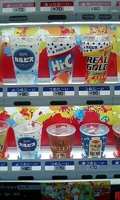 ありゃ、カップを取り出すとリアルゴールドの色じゃない、なんか乳白色がかった黄色…自販機よく見たらカルピスがミックスされてるよ〜。