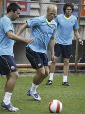 サッカーのスペイン1部リーグ、バルセロナは来季開幕前の親善試合ツアーでグジョンセン(中央)など主力選手などが欠場することを明らかに。写真は21日、左からデコ、グジョンセン、モッタ