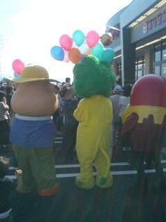 そしていつもオープン初日に登場する記念撮影三人衆がいます。カールおじさん、ライオンちゃん、キョロちゃん。