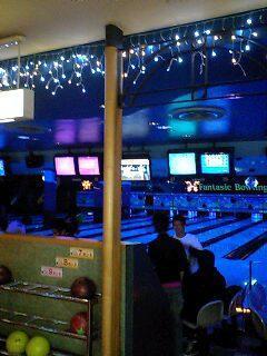 二次会はボーリング!すでに0時過ぎ。やっぱりこれでお開きにならず、待ち時間に卓球。ボーリングは画像のブラックライトがアヤシく光る暗いレーンでやりました。女子が高得点を出し、男子メンバー意気消沈。