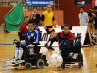 電動車いすサッカーは、コントローラーで操作する電動車いすに足を守るフットガードを付け、そのガードにボールを当ててプレーする。時速は最高で16km(今大会ルールでは10km)。大きくキックするときは180度回転して弾みを付けたり、体当たりでボールを奪い合ったりと、かなり激しい動きで20分ハーフを駆け抜ける。フィールドプレーヤーは4人(うち1人がGK)。ボールの大きさは直径32.5cmと通常の1.5倍。