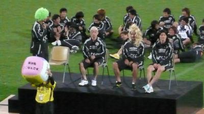 ヨシユキ(右から2番目、ブロンドの長髪のヅラ)は、このような催しに自分のキャラでは絶対合わないと、うかぬ表情で座っておりますが、弟(小林亮)の友人タニ(左端の緑のアフロのヅラ)の発言で窮地に陥ります。遂に柏レイソルの洗礼を受けてしまいました。静のヨシユキからお笑い系ヨシユキに変われたか・・・。(秘密)
