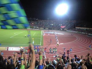 先週の観客動員、1万人作戦には及びませんが、その効果もあってか、この日もなかなかの観客の入り。早々に空けられた両ゴール裏も、甲府側から結構人が入って参ります。今節はコレオが無いため、開始前の慌ただしさも無く、いつもの仲間も試合に集中できる中、キックオフされた試合は、両チームのこの試合にかける意気込みが感じられる、玉際の攻防に厳しさの感じられるものでした。