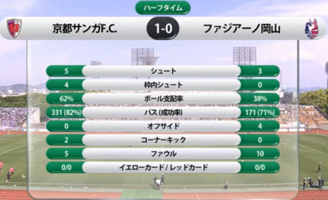 これで一気に京都ペースになり、ボールを奪えない岡山。前半の残り10分を切って