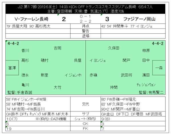 2019 J2 第17節 長崎 2-3 岡山 @トラスタ