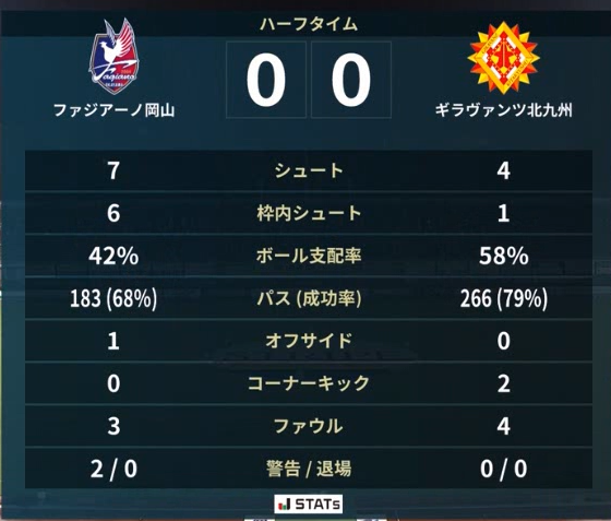 立ち上がり、北九州のハイプレスに戸惑っていた岡山はロングボールを多用するも