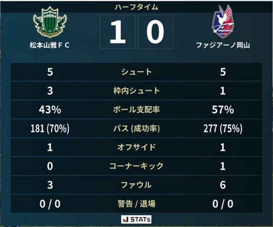 前回対戦成績 2020年9月2日 J2第16節 岡山1-0松本山雅@Cスタ