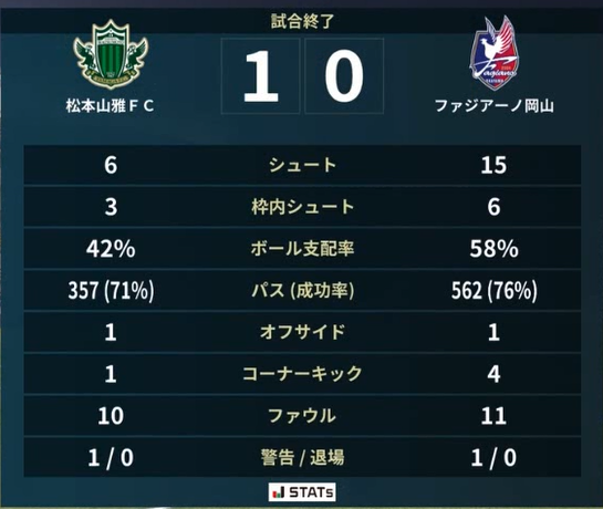 松本戦2013年以来となる12試合ぶりの敗戦でアウェイ3連敗となった。