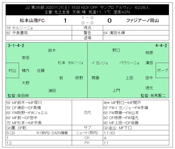 2020 J2 第35節 松本山雅 1-0 岡山 @サンアル