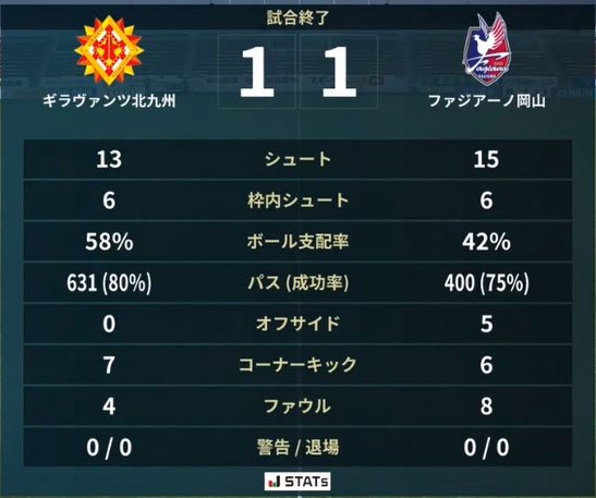 前回対戦成績 2020年7月10日 J2第4節 岡山0-2北九州@Cスタ