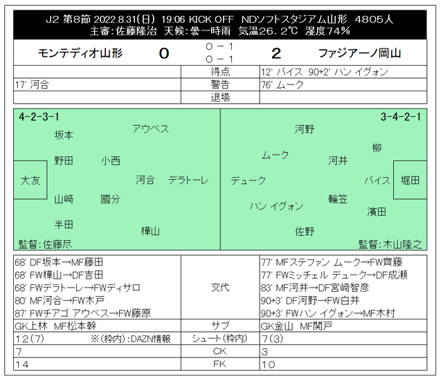 ちなみに今季の対戦は 2022年4月3日 J2第8節 山形0-1岡山@NDスタ