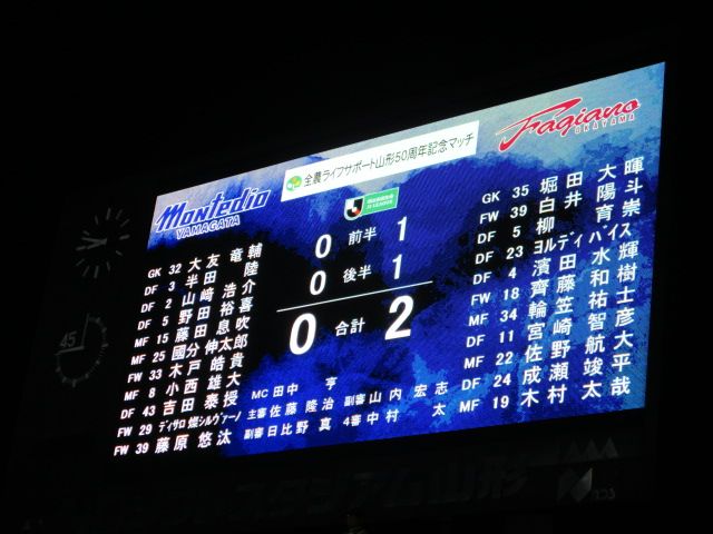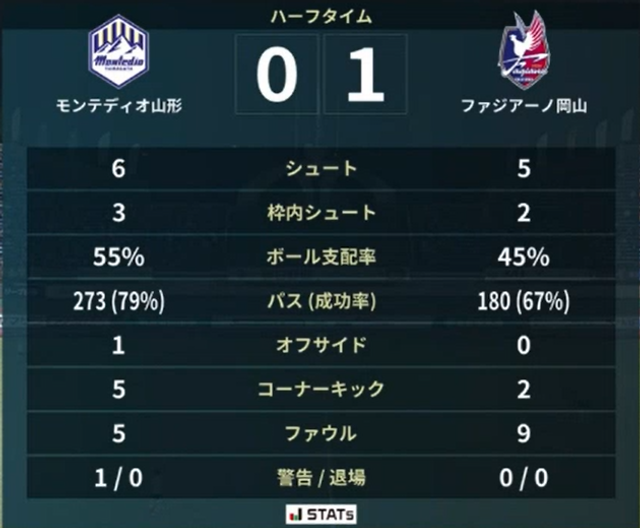 その後も、山形ペースで進むも岡山1点リードで前半折り返し。