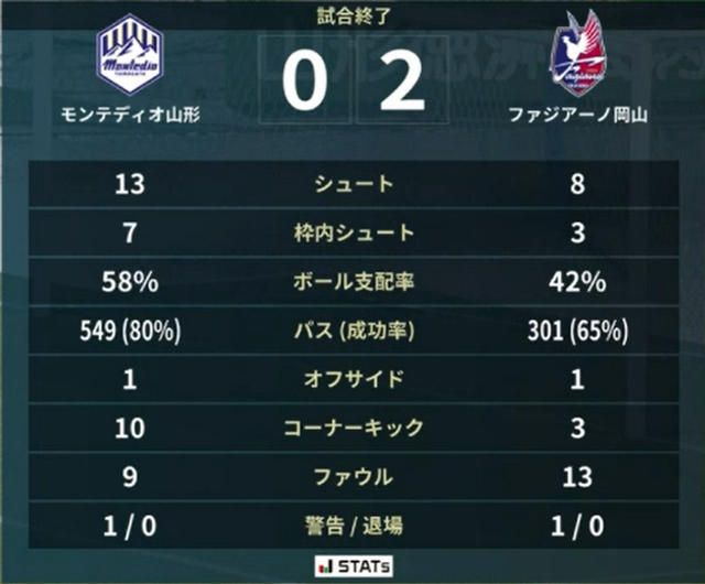 前回対戦成績 2021年11月7日 J2第38節 岡山1-0山形@Cスタ