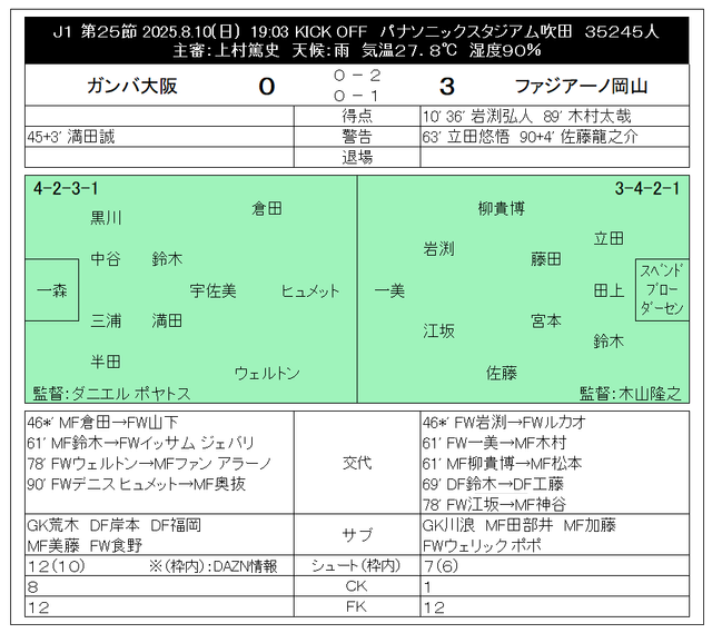 2025 J1 第25節 G大阪 0-3 岡山@パナスタ