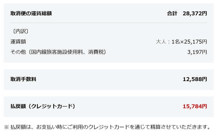 催行決定の連絡が来たので、航空券のキャンセル代12588円(税抜運賃の50%)で