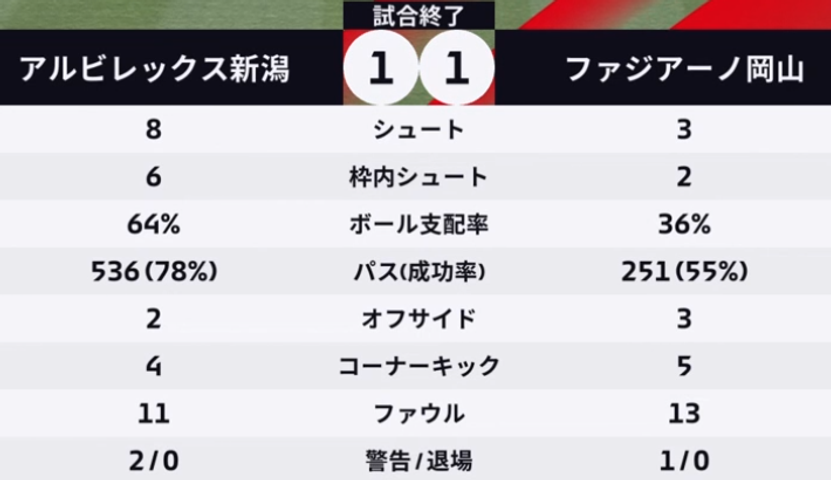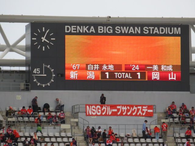 新潟ペースでしたが、ゴール前では岡山守備網が立ちはだかり、決定機は作らせず、