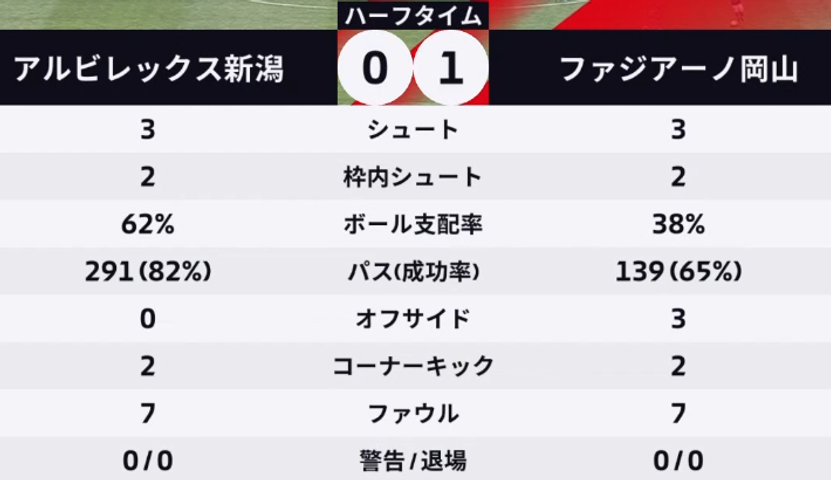 その後、岡山が押し込むも追加点は取れず、岡山リードで前半折り返し。