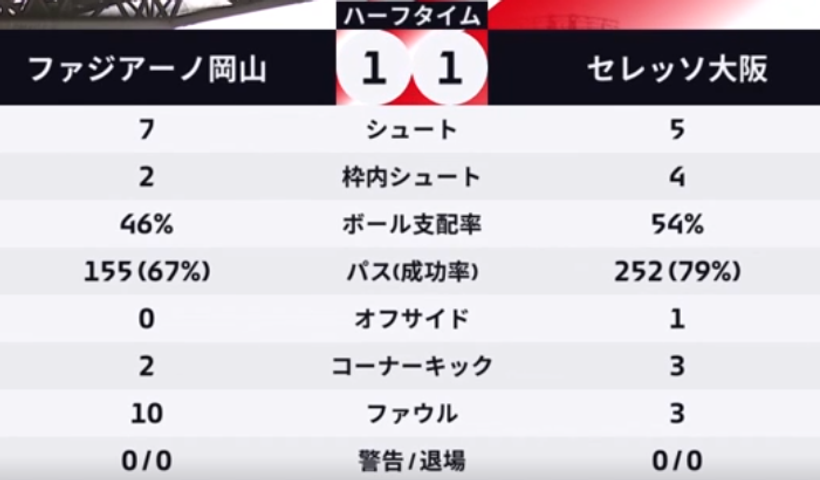 ここからC大阪が押し込む時間帯になるも、最初にゴールネットを揺らしたのは岡山。