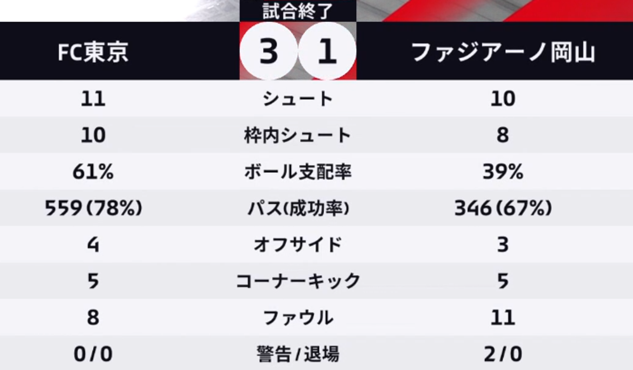 岡山は後半盛り返し、ほぼ同数のシュート数を放つも、個の決定力の差が出た敗戦でしたが
