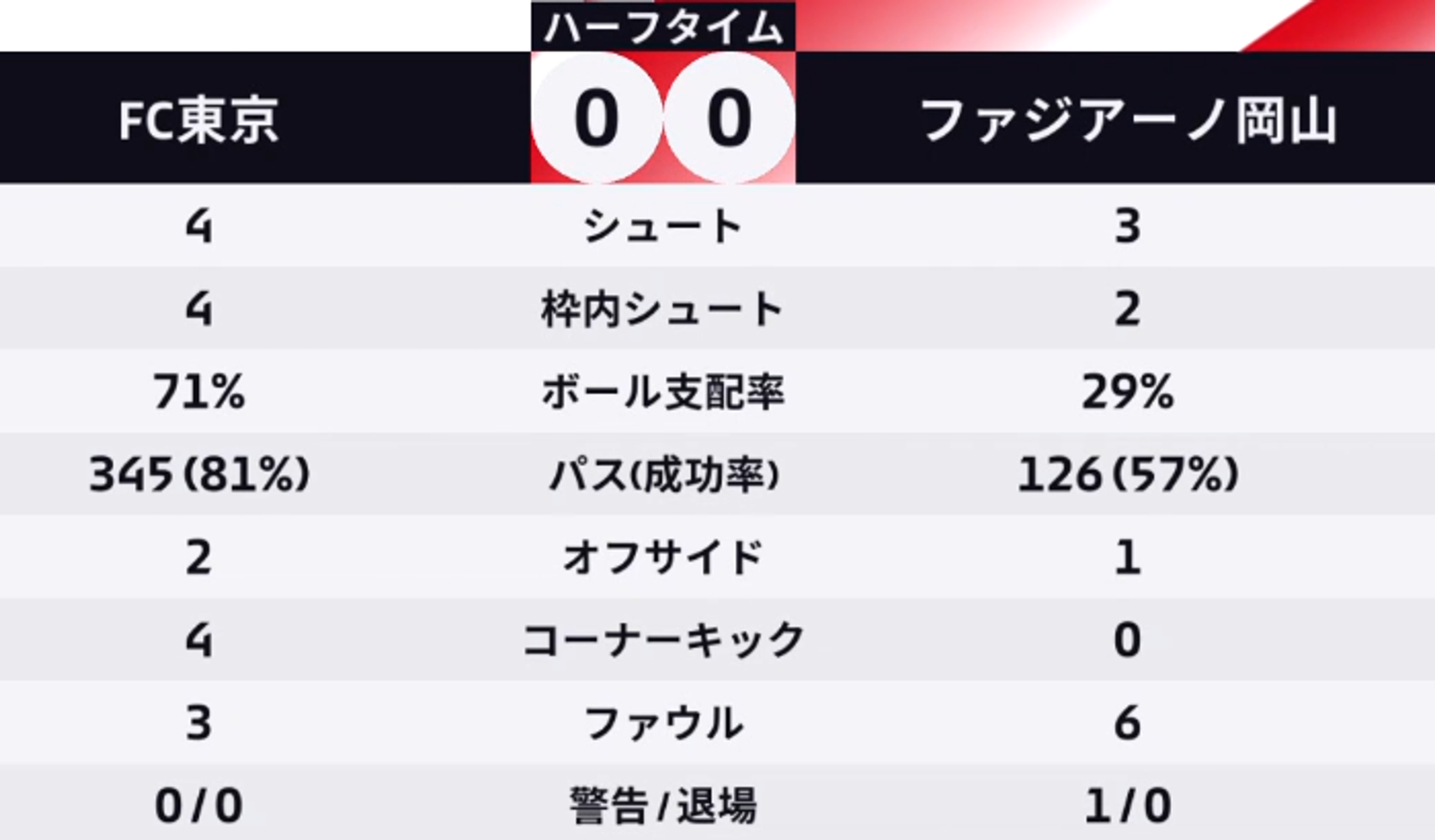 FC東京ボールでキックオフし、前半は完全にFC東京優勢でしたが、互いにシュート数は少なく、