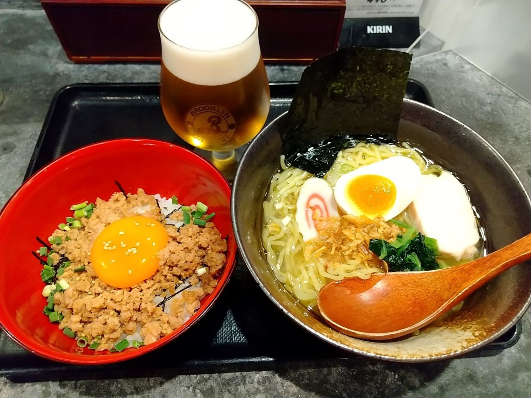 特製 丸鶏らーめんと鶏そぼろごはんセット1500円とランチビール380円