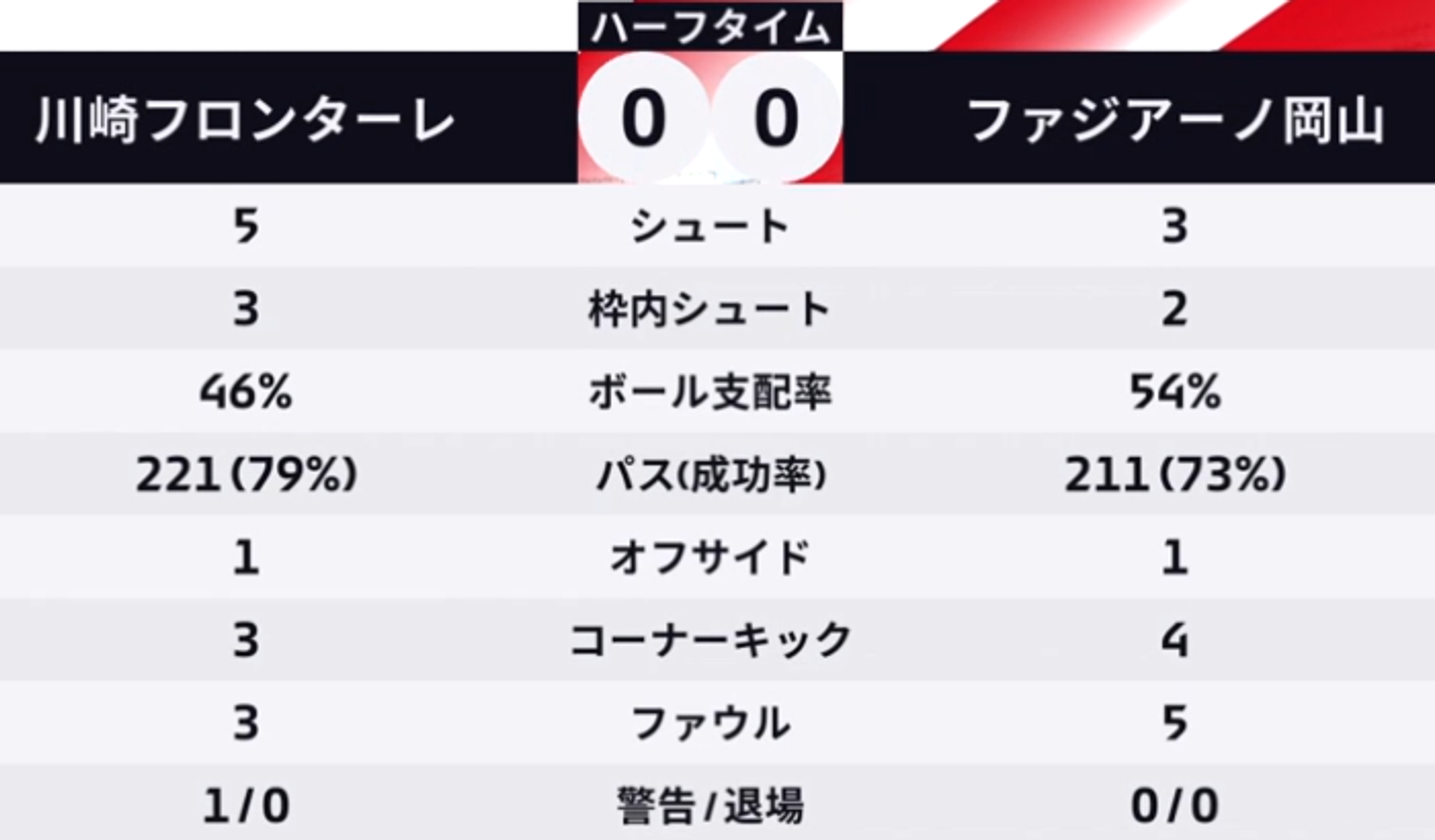 岡山ボールでキックオフし、予想に反して岡山のボール支配率が上回った前半で