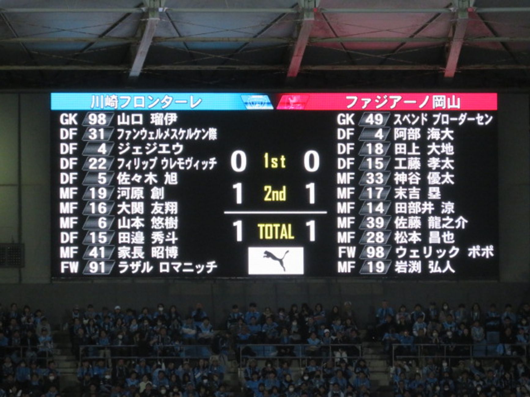 決定機は川崎の方が多かったが退場明けのGKブローダーセンの好守に阻まれ決め切れず、