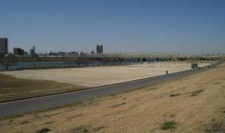 電車から荒川河川敷のグラウンドを見ると、野球グラウンドは水溜りだらけでした。