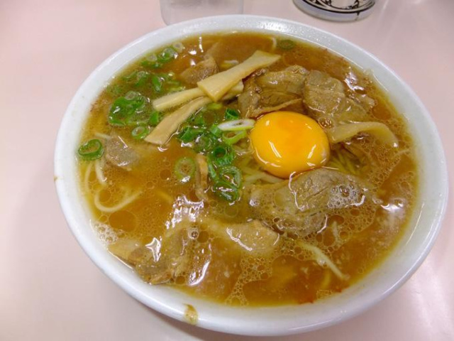 ちょっと甘みのあるとんこつ醤油スープに、味付けした豚バラ肉と、生卵ね。