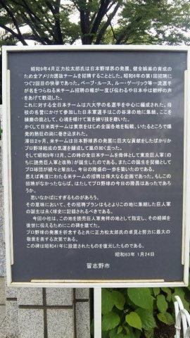 1934年秋、読売新聞の正力松太郎氏がベーブ・ルースなどアメリカ・メジャーリーグの一行を日本に招聘した。その相手をするために東京六大学の選手を中心に全日本チームが編成され、後にこのチームが母体となり巨人軍が誕生したのである。その全日本チームのために提供されたのが谷津遊園内のグラウンドであった。