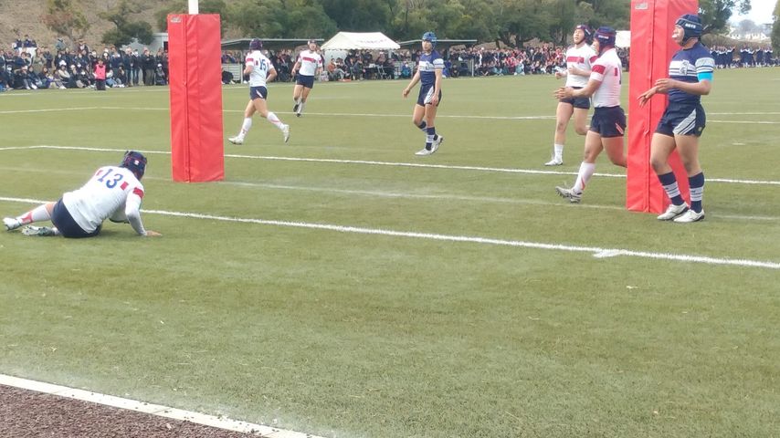 試合の方は、前半5分頃に桐蔭学園が先制トライ、コンバージョンも成功して 7 - 0 とする。その後も2トライ、1コンバージョン成功で 19 - 0 とする。東海大相模も、前半終了間際にトライ、コンバージョンも成功して 19 - 7 で前半終了。