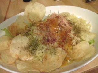 ポテチはタマネギ,レタス,中華麺くんたちと和えて、ラーメンサラダに。