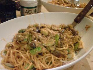 アボカド、アスパラガス、ナス、お豆腐をヒキワリナットゥと赤ワインのソース、オリーブオイルで和えた絶妙の一品。