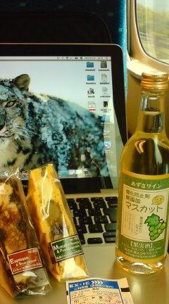 東京までのお相手は岡山駅で仕入れたマスカットワインとマスカットのワッフル。