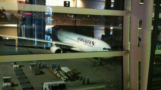 受付「ハワイアン航空458便は機材の到着が遅れ出発が早朝5:45となりますm(__)m」