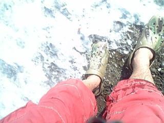 釣りの合間に波打ち際で海水の冷たさを感じ