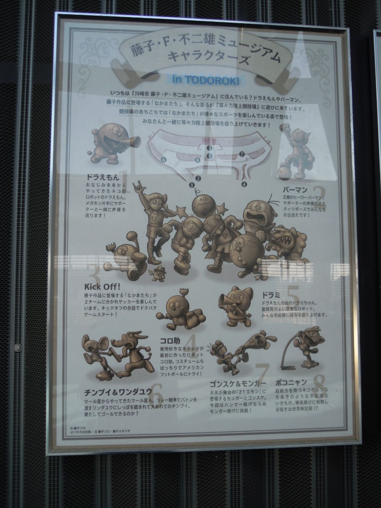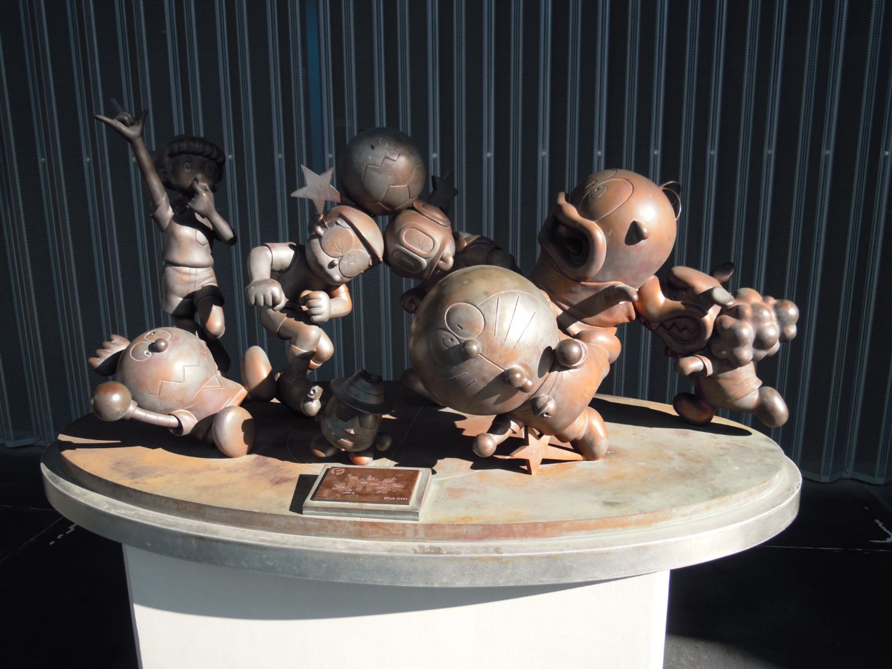 試合の合間にトイレに行くと、通路に藤子・F・不二雄氏漫画作品のキャラクターのブロンズ像が。