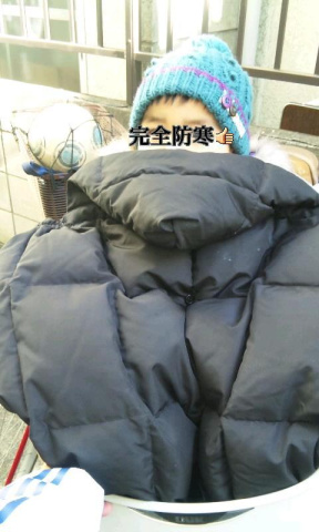 あまりにも寒くてダウン前掛けの中に入っちゃいました(笑)