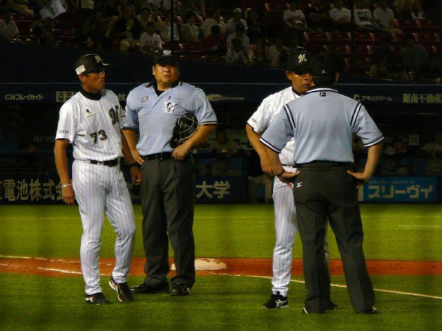 ・・時間稼ぎに?抗議に来ます・・ボコッ!!という落下した様な音はしましたがあの判定は一塁塁審が橋本なら仕方ありません。